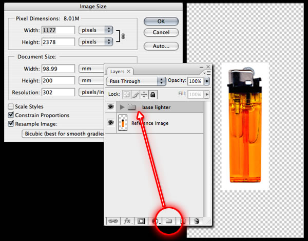 Create a new transparent document with the settings below of 99mm x 200mm at 300dpi. Place your reference image in the middle of your new document, and name the layer. In fact, as you go through these steps, ensure you name all your layers. Above your reference layer create a layer set and name it "base lighter". This layer set will be where you keep your main vector shapes.