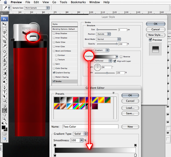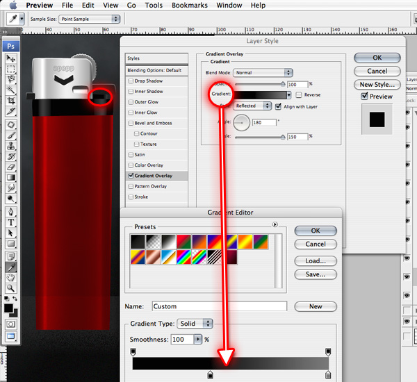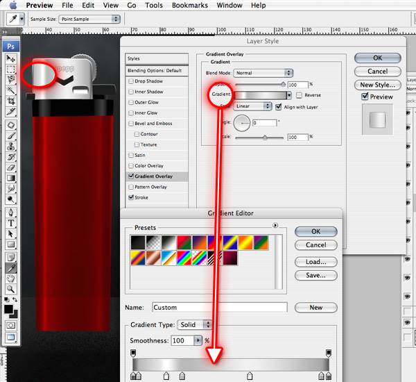 To edit the actual gradient, click on the gradient preview as shown on image below to reveal the Gradient Editor.