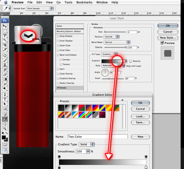 Now that we have all the essential elements built, we can begin to give depth to the base lighter using layer styles. Turn on the layer set "base lighter" and from top to bottom we'll add the layer effects required. Before that, we will color each vector object as follows by double-clicking the vector layer thumbnail as highlighted below. Do also check the "Red Casing" blending mode is set to "Hard Light", and make sure all other layer modes are "Normal".