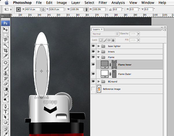 The flame is simply made of two vector shape layers. Grab the Ellipse tool (in shape layer mode), and draw the largest "Flame Outer" first. Make sure it is pure white too. The flame also needs to be below the "Base Lighter" layer set so it sits under the metal casing.