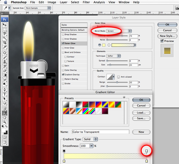 Double-click the "Flame Outer" layer to bring up the layer styles dialog and set them as follows:
