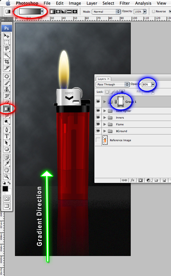 Now select the layer mask created in Step 17. With the Gradient Tool, set a white-to-black gradient and drag from the bottom to where the arrow finishes in the image below. Set the layer set opacity to 80%.