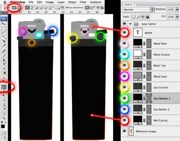 Using the Pen Tool (P), in shape-layer mode, begin to construct the lighter into sections (eight total), using the reference image for rough guidance. It doesn't have to be exact the first time because shape layers are further editable using the Pen Tool and its associated tools. The color-coded image below indicates layer ordering, which is important. The main plastic case is at the bottom. The very top has a text layer for a bit of personalization. I chose my screen name "apepp" using the font Helvetica Neue Condensed Bold.