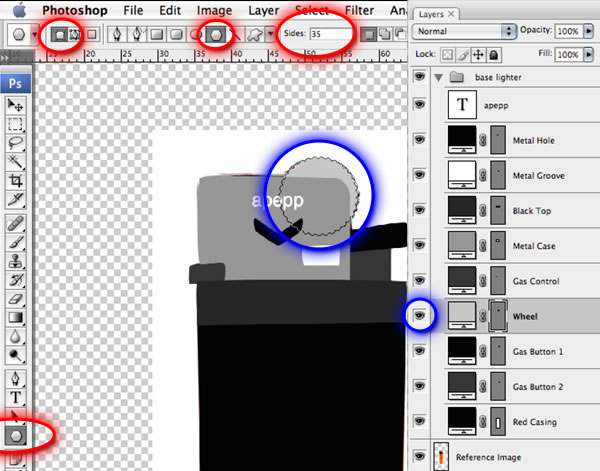 For the flint "Wheel" layer, use the Polygon Tool (Shift + U ) in shape-layer mode, and set the number of sides to approximately 35. Click and drag to an appropriate size. While the mouse button is still held down, hold the space bar and move it into position. Then release the space bar and further adjust the size if required. When you release the mouse, the layer will be created. This layer needs to be somewhere underneath the metal case.
