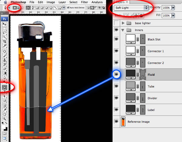 The last part for the inner section is the "Fluid" layer. Create this using the Pen Tool (P) in shape-layer mode (a touch short of the plastic case edges) and move it above the "Tube" layer. Color the "Fluid" vector layer with something like #282828 and change the layer mode to "Soft Light". Changing layer blending modes can also be done by pressing "Shift" and using the + or – keys.