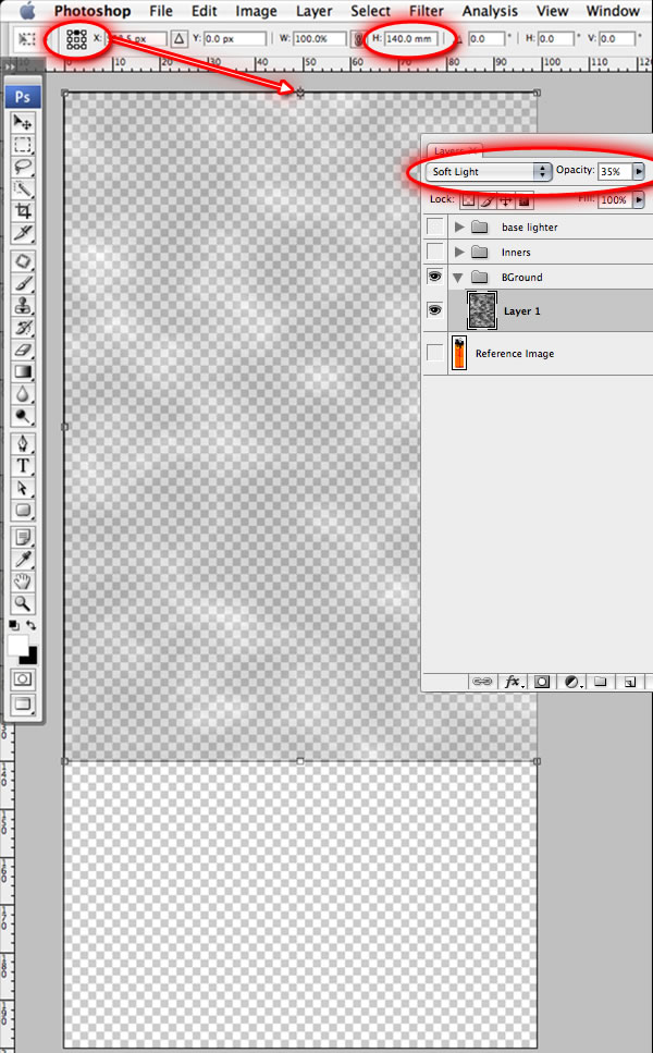 Now for the background effect. First hide both the "base lighter" and "Inners" layer sets. Create another layer set called "BGround" or something similar. Add a new layer to this layer set, then choose Filter > Render > Clouds. Press "Command/Apple + T", change the anchor point to the top row via the proxy image in the toolbar. Then type into the height field "140mm", and press the return key to commit this adjustment. Change the layer mode to "Soft Light" and the Opacity to 35%. If you quickly type 35 on your keypad, the opacity will change. Name this layer "Smoke".
