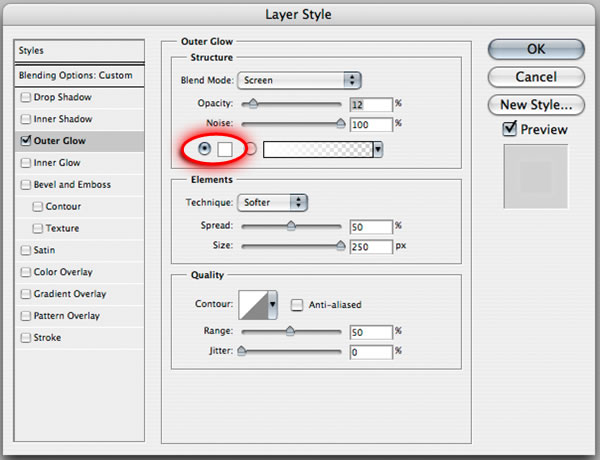 Still on the "Smoke" layer, double-click the space right-hand side of the layer thumbnail to bring up the layer effects dialog to apply an "Outer Glow". This is to simulate a table edge with light being diffused off the surface. Change the default yellow to white by clicking the yellow square under the noise setting. The other settings are as follows: