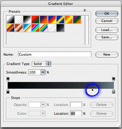 Under the "Smoke" layer, create a new layer called "Light". Select the Gradient Tool, set a new gradient by clicking the gradient preview in the top toolbar, set the left bottom slider to black #000000 and the right-bottom slider to a blue/gray #78828c, and the mid-point slider to 80%.